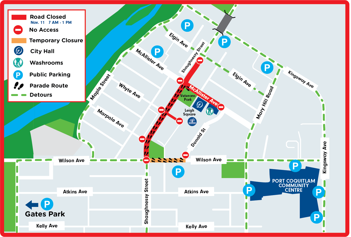 Parking is available in various downtown locations and at the Port Coquitlam Community Centre (PCCC). Please note parking at Port Coquitlam Community Centre is permitted only until 1pm. Vehicles must be removed by this time to avoid being locked in.