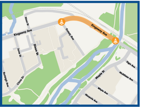 Please be advised there will be single-lane alternating traffic in place tomorrow, August 27, for construction of the multi-use pathway on Kingsway between Gately Avenue and the bridge west of Maple Street. Work will take place between 7am-7pm.